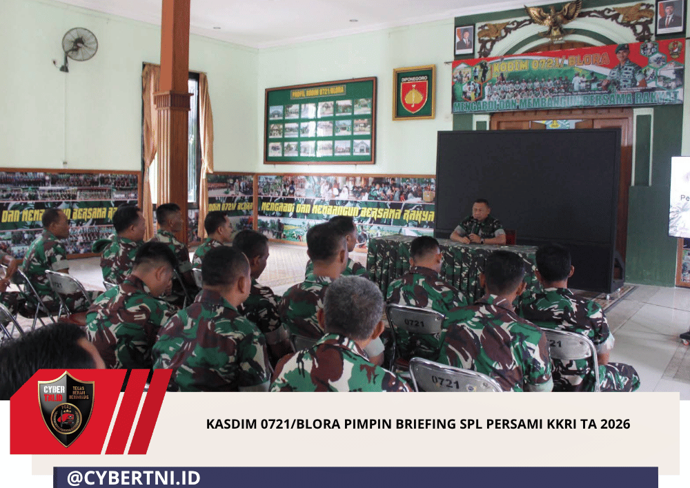 CyberTNI.id | Blora, 26 Maret 2026 – Kodim 0721/Blora melaksanakan kegiatan Briefing SPL Persami Korps Kadet Republik Indonesia (KKRI) Kodam IV/Diponegoro Tahun Anggaran 2026. Kegiatan tersebut dipimpin oleh Kepala Staf Kodim (Kasdim) 0721/Blora, Mayor Inf Bani, bertempat di Aula Makodim 0721/Blora, Jl. Pemuda No. 44 Blora.