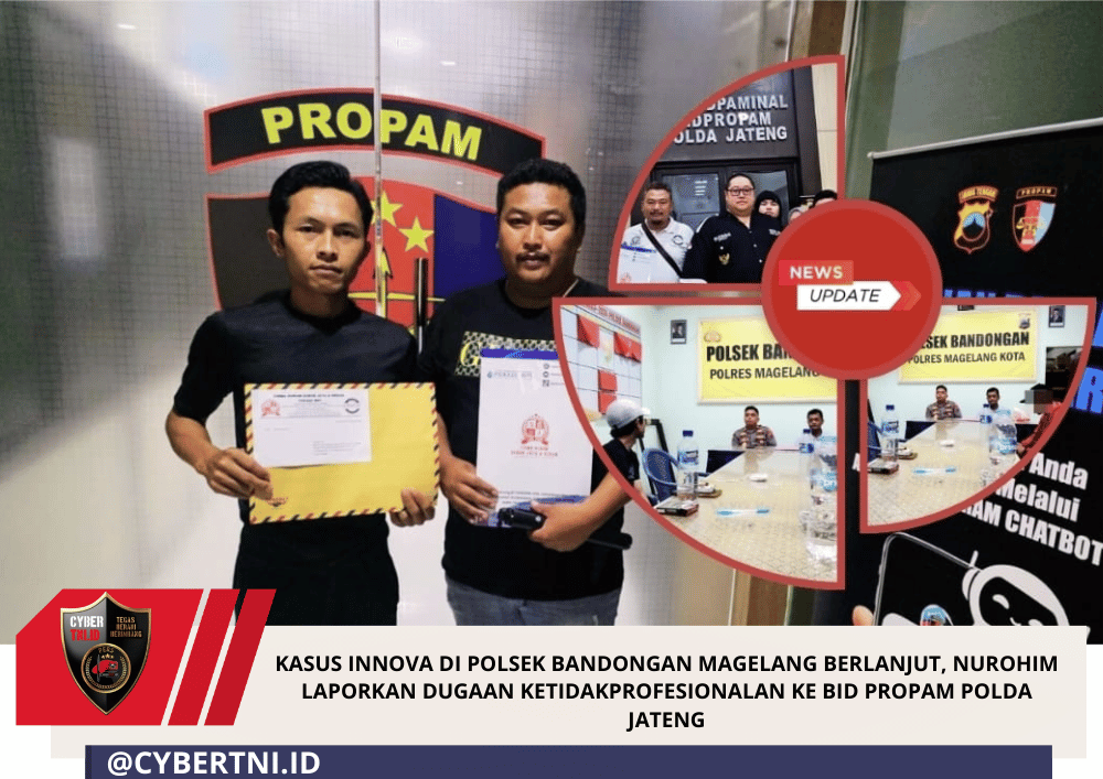 CyberTNI.id | Semarang — Perkara dugaan penguasaan kembali satu unit Toyota Innova tahun 2009 yang dimediasi di Polsek Bandongan, Kabupaten Magelang, berlanjut ke tingkat Polda. Pada Minggu, 15 Februari 2026, Nurohim secara resmi menyampaikan laporan kepada Kepala Bidang Profesi dan Pengamanan (Propam) Polda Jawa Tengah terkait proses penanganan dan mediasi yang dilakukan di tingkat Polsek.