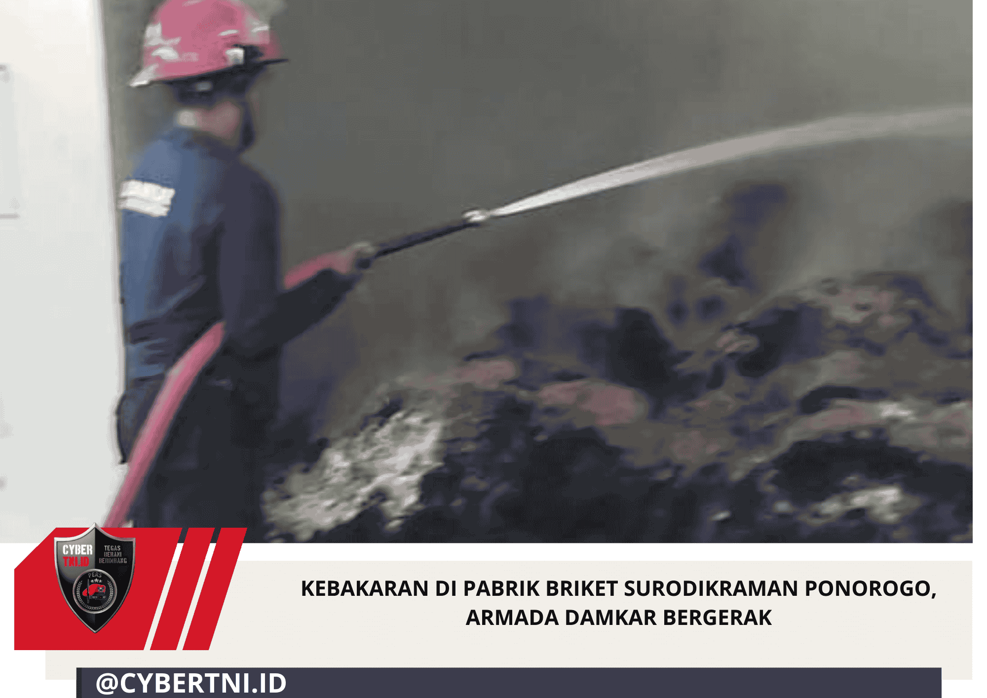 CyberTNI.id | PONOROGO,Minggu (18/1/2026) — Personel Pemadam Kebakaran (Damkar) Satpol PP Kabupaten Ponorogo bergerak cepat menjinakkan si jago merah yang melahap gudang bahan briket di Jalan Jend. Ahmad Yani No. 100, Kelurahan Surodikraman, Kecamatan Ponorogo Provinsi Jawa timur.
