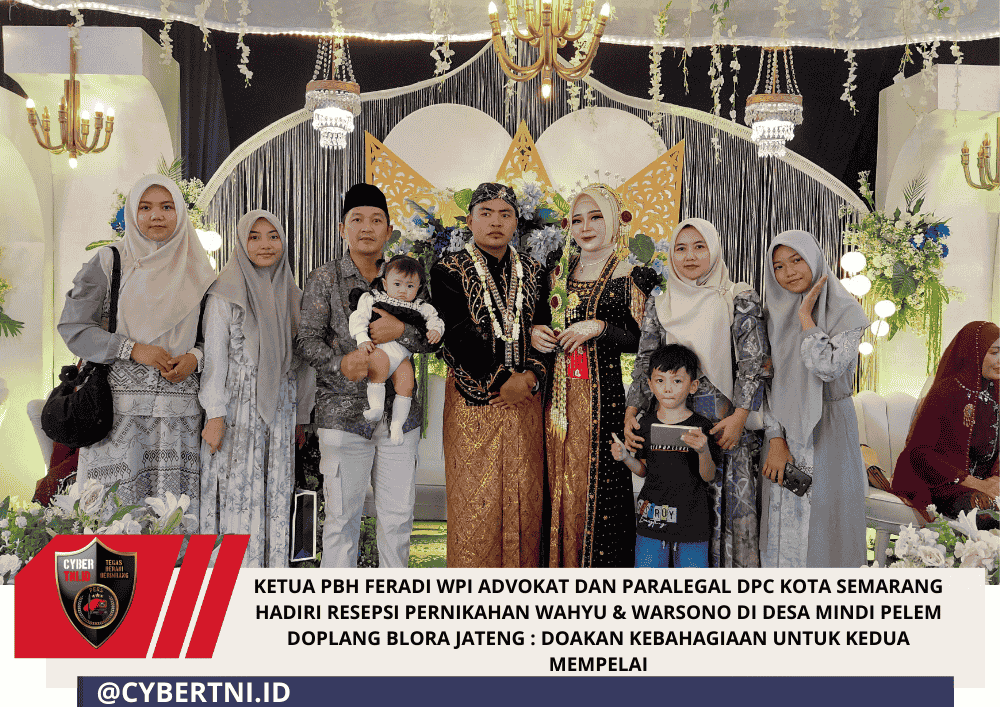 CyberTNI.id | Blora,Jumat (13/2/26) — Dalam suasana penuh kehangatan dan kebersamaan, Ketua PBH FERADI WPI Advokat dan Paralegal DPC Kota Semarang , Sukindar SH.,SPD.,C.PFW.,C.MDF.,C.JKJ , menghadiri undangan resepsi pernikahan Wahyu & Warsono di Blora dukuh Mindi desa Pelem , Kecamatan Doplang,Kabupaten Blora Jawa Tengah. Darjo beserta Keluarga besar yang punya hajat adalah masih kerabat dari Kakak dari Sukindar nomer 1 yang tinggal di Mindi bersama Yunanik Kakak perempuan nomer 2 serta adik Suparti tinggal disemarang .Bertempat saudara ini merupakan anak kandung dari mbah jiyem Mindi, dan Tampak terlihat pada kesempatan itu Mbah jiyem dengan Sukiman hadir dalam menerima para tamu undangan tersebut.
