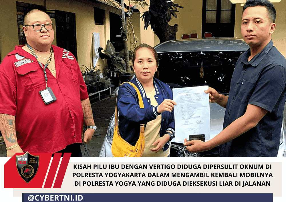 CyberTNI.id | Polresta Yogyakarta, Rabu, 21 Februari 2026 — Pengalaman tidak mengenakan dialami seorang ibu yang berinisial A.J. Kejadian berawal ibu AJ mendapat kabar bahwa unit mobil Toyota Calya 1.2 MT tahun 2021 No.Pol H1838BV warna Silver Metalik, ketika dipakai Keponakannya di Jalanan Yogyakarta, di duga terjadi eksekusi paksa dan liar oleh segerombolan oknum yang diduga mengaku utusan dari Toyota Astra Finance ( dugaan ), dan saat ini kendaraan tersebut diduga berada dalam Penguasaan Polresta Yogyakarta.