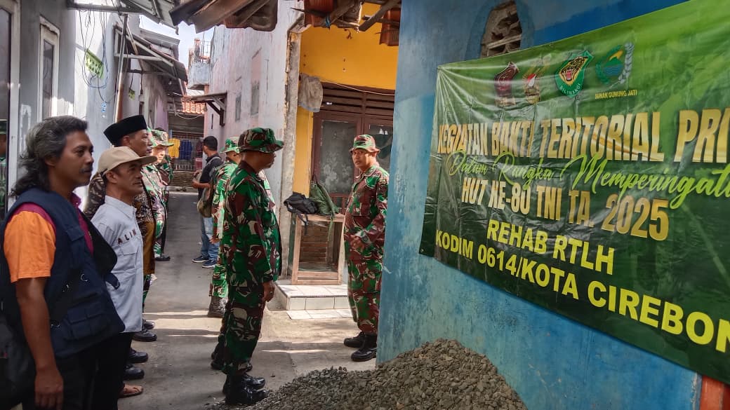 CyberTNI.id | Kota Cirebon, (Rabu, 10/9/2025), – Dalam rangka memperingati Hari Ulang Tahun (HUT) ke-80 Tentara Nasional Indonesia (TNI) tahun 2025, Kodim 0614/Kota Cirebon menyelenggarakan kegiatan perehaban Rumah Tidak Layak Huni (RTLH) menjadi Rumah Layak Huni. Kegiatan tersebut dilaksanakan di rumah milik Bapak Nurjaman yang berlokasi di Gang Bandeng RT 02 RW 07 Pesisir Tengah, Kelurahan Panjunan, Kecamatan Lemahwungkuk, Kota Cirebon.