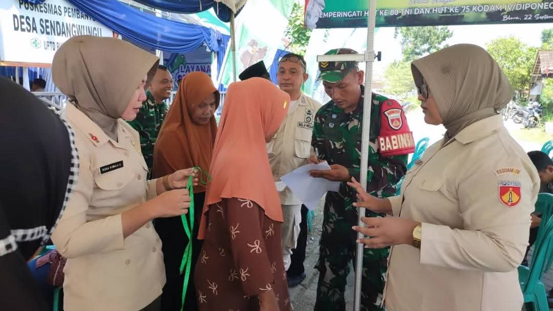CyberTNI.id | BLORA, Senin 22 September 2025 – Dalam rangka memperingati Hari Ulang Tahun (HUT) ke-80 Tentara Nasional Indonesia (TNI) dan HUT ke-75 Kodam IV/Diponegoro, Komando Distrik Militer (Kodim) 0721/Blora menggelar kegiatan Bakti Teritorial Prima Pengobatan Gratis bagi masyarakat. Acara berlangsung di Puskesmas Pembantu (Pustu) Desa Sendangwungu, Kecamatan Banjarejo, Kabupaten Blora, Senin (22/9/2025).