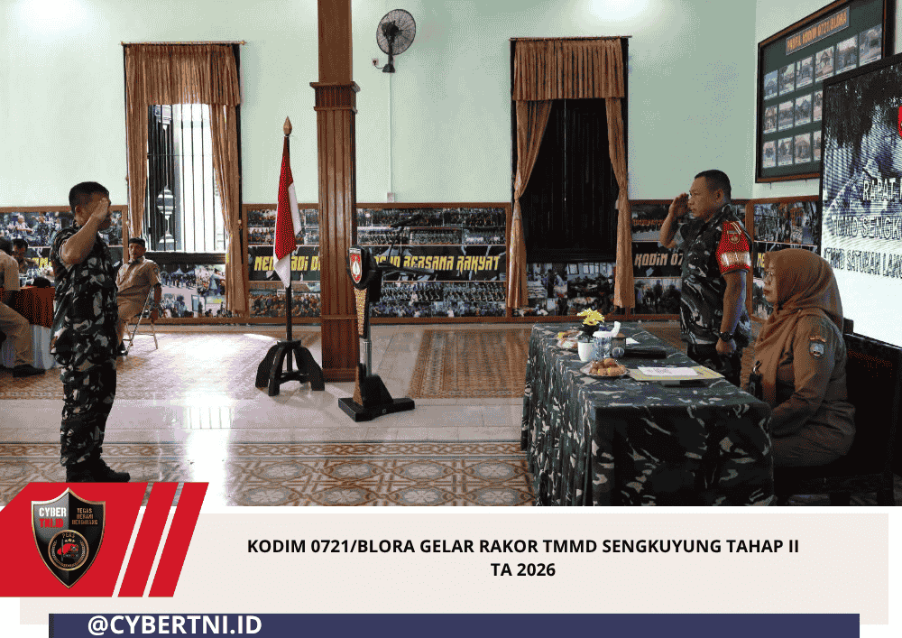 CyberTNI.id | Blora — Dalam rangka persiapan pelaksanaan program TNI Manunggal Membangun Desa (TMMD) Sengkuyung Tahap II Tahun Anggaran 2026, Komando Distrik Militer (Kodim) 0721/Blora menggelar Rapat Koordinasi Teknis (Rakornis) yang bertempat di Aula Makodim 0721/Blora, Jalan Pemuda No. 44 Blora, Senin (20/4/2026).