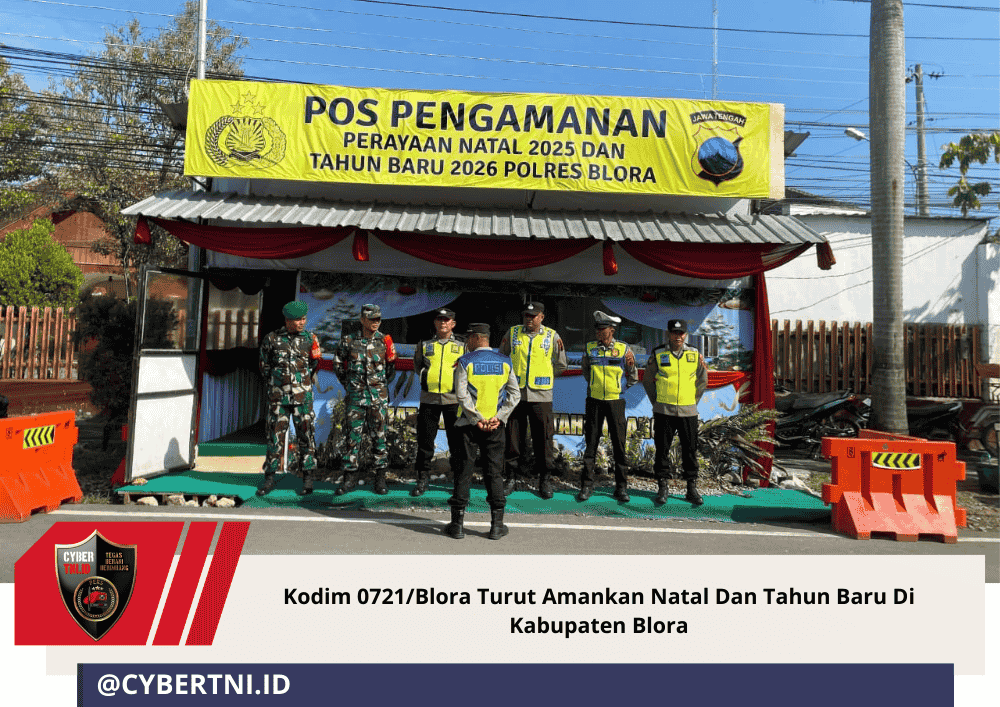 CyberTNI.id | BLORA – Kodim 0721/Blora bersama Polres Blora melaksanakan pengamanan perayaan Natal dan Tahun Baru (Nataru) 2025/2026 di wilayah Kabupaten Blora. Pengamanan dilakukan melalui pendirian Pos Pengamanan (Pos Pam) dan Pos Pelayanan (Pos Yan), Senin (22/12/2025).