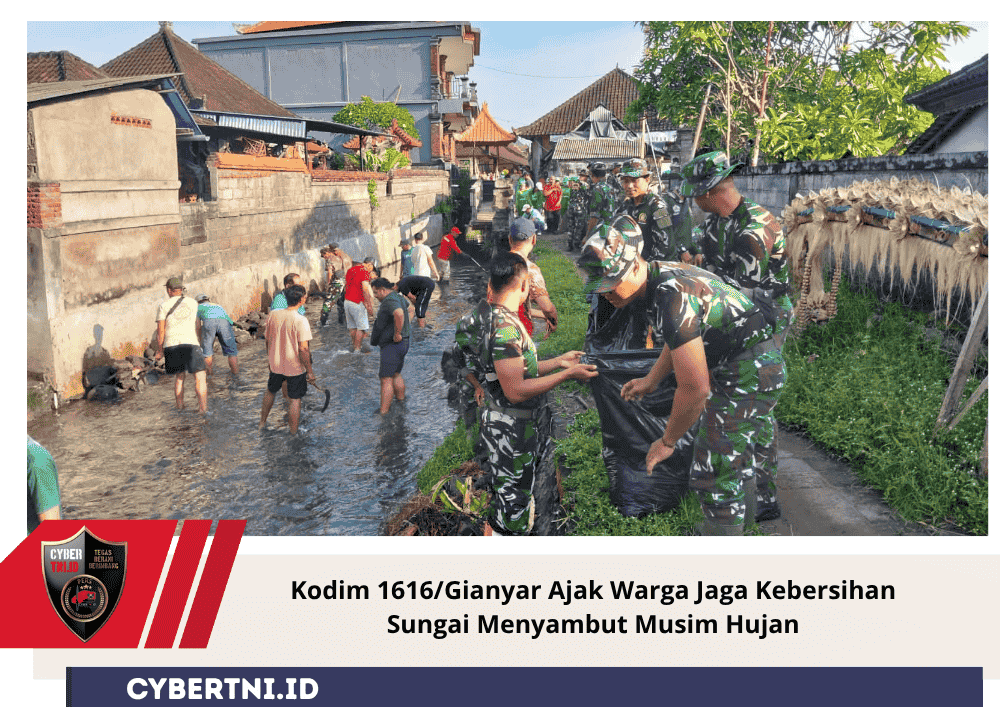 CyberTNI.id | Gianyar, Senin 27 Oktober 2025 – Abianbase, Dalam rangka Gotong Royong Semesta Berencana Bersih-bersih Sungai serta memperingati Rahinan Tumpek Wariga (Wana Kerthi), Kodim 1616/Gianyar dipimpin langsung oleh Dandim 1616/Gianyar Letkol Kav Rizal Wijaya, S.H., M.I.P., bersama unsur Forkopimda Kabupaten Gianyar dan masyarakat melaksanakan kegiatan karya bakti pembersihan sungai di Sungai Bunga, Desa Abianbase, Kelurahan Abianbase, Kecamatan Gianyar, Kabupaten Gianyar. Kegiatan ini menjadi salah satu bentuk nyata kepedulian terhadap lingkungan serta wujud implementasi nilai-nilai “Nangun Sat Kerthi Loka Bali”.