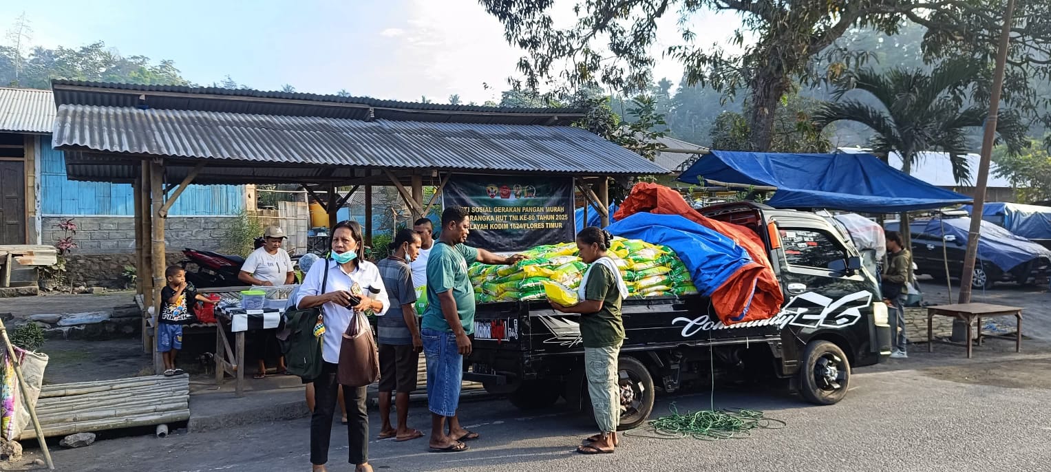 CyberTNI.id | Boru, Flotim, Senin 29 September 2025 — Dalam rangka memperingati Hari Ulang Tahun ke-80 Tentara Nasional Indonesia (TNI), Kodim 1624/Flores Timur kembali melaksanakan kegiatan bakti sosial berupa Gerakan Pangan Murah. Kali ini kegiatan dipusatkan di Pasar Boru, Desa Boru, Kecamatan Wulanggitang, Kabupaten Flores Timur, Senin (29/9/2025).