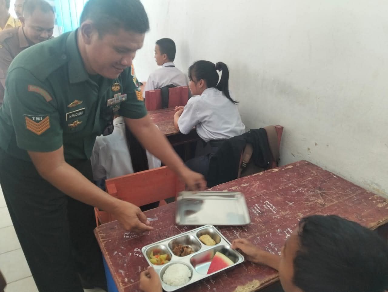 CyberTNI.id | Nias Selatan, Senin 13 Oktober 2025 — Personil Koramil 04/Lahusa a.n Serma Marius Maduwu dan Sertu Sony H.W Ndruru, Menghadiri Undangan Kegiatan Pembukaan Satuan Pelayanan Pemenuhan Gizi (SPPG) MBG Yayasan Pengembangan Potensi Sumber Daya Pertahanan (YPPSDP) dan penyaluran langsung ke 2 sekolah perwakilan SMP Negeri I Lahusa dan SDN No.075102 Bawozihono, bertempat di Desa Hiliorudua Kec. Lahusa Kab. Nias Selatan. Senin, 13/10/25.