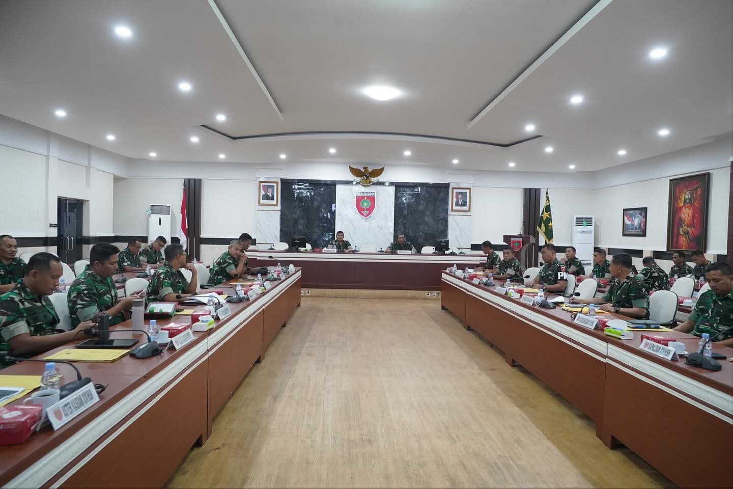 CyberTNI.id  | Makassar, Jumat 14 November 2025 – Kasdam XIV/Hasanuddin Brigjen TNI Sugeng Hartono, S.E., M.M., menerima paparan Rencana Garis Besar (RGB) Latihan Posko I dan Latihan Lapangan Korem 143/Haluoleo TA.2025, bertempat di Ruang Bina Yudha (RBY) Makodam, Jl. Urip Sumoharjo, Kota Makassar. Jumat, (14/11/2025).