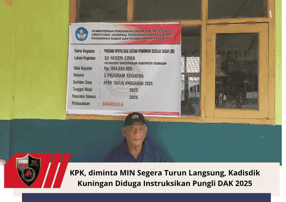 CyberTNI.id | KUNINGAN, 01 November 2025 — Masalah besar menerpa Dinas Pendidikan dan Kebudayaan Kabupaten Kuningan, belum berakhir masalah DAK 2024 lalu, kini muncul kembali Bantuan Dana Alokasi Khusus (DAK) tahun 2025, Program Revitalisasi Satuan Pendidikan Sekolah Dasar (SD), Sekolah Menengah Pertama (SMP) dan Pendidikan Anak Usia Dini (PAUD), diduga keras oknum Kadisdik Calon Kuat Sekretaris Daerah (Sekda) memerintahkan lagi pungutan (Pungli) melalui pihak ketiga yang berinisial Md dan An, Konsultan yang ditunjuk Kadisdik, sebagai pengawas lapangan pekerjaan fisik DAK 2025.