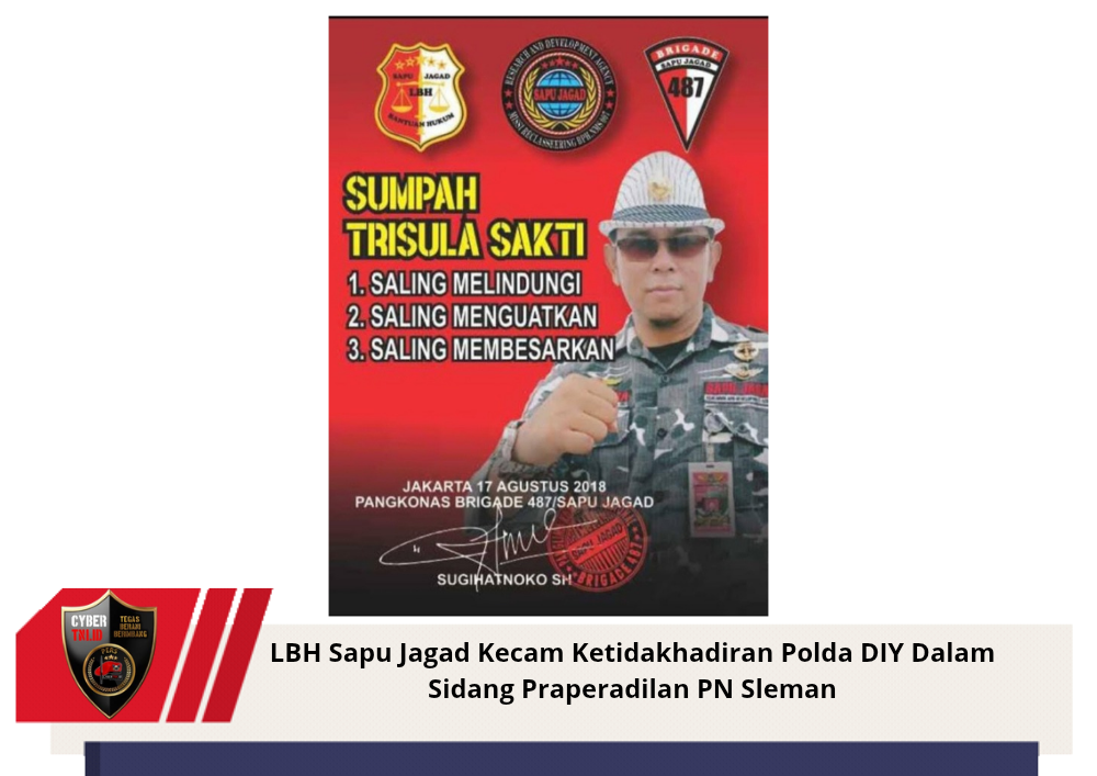 CyberTNI.id |SLEMAN,Selasa (4/11/ 2025) — Lembaga Bantuan Hukum (LBH) Sapu Jagad menyampaikan pernyataan sikap tegas terkait ketidakhadiran Polda Daerah Istimewa Yogyakarta (DIY) dalam sidang perdana praperadilan di Pengadilan Negeri Sleman, Selasa (4/11/2025). Sidang tersebut merupakan perkara antara RM Triyanto Prastowo sebagai pemohon melawan Polda DIY sebagai termohon.