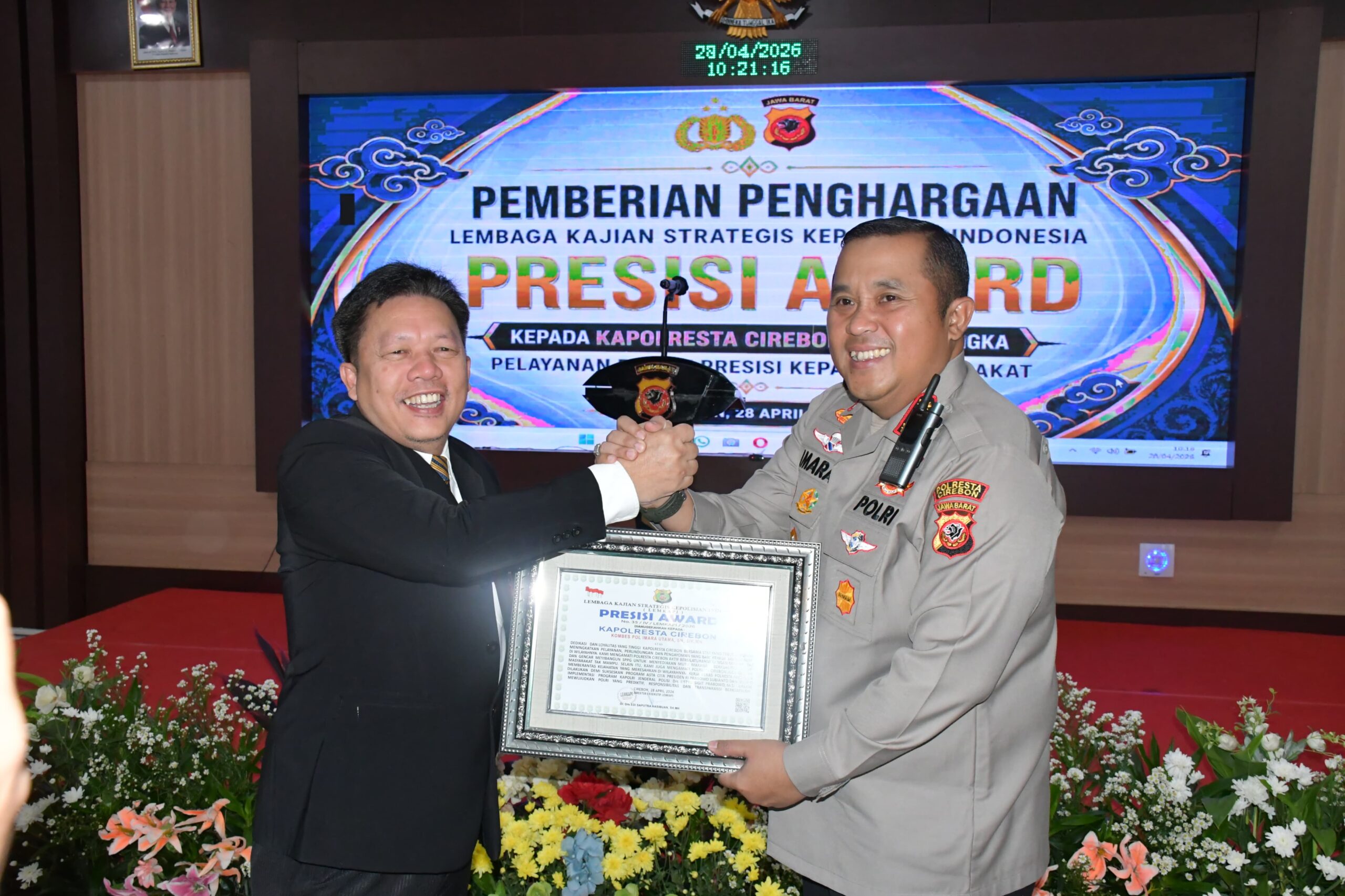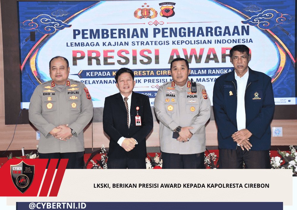 CyberTNI.id |CIREBON, 28-04-2026 — Kapolresta Cirebon Kombes Pol Imara Utama, S.H., S.I.K., M.H., menerima penghargaan Presisi Award dari Lembaga Kajian Strategis Kepolisian Indonesia dalam sebuah kegiatan yang berlangsung di Aula Pesat Gatra Mapolresta Cirebon, Selasa (28/4/2026).