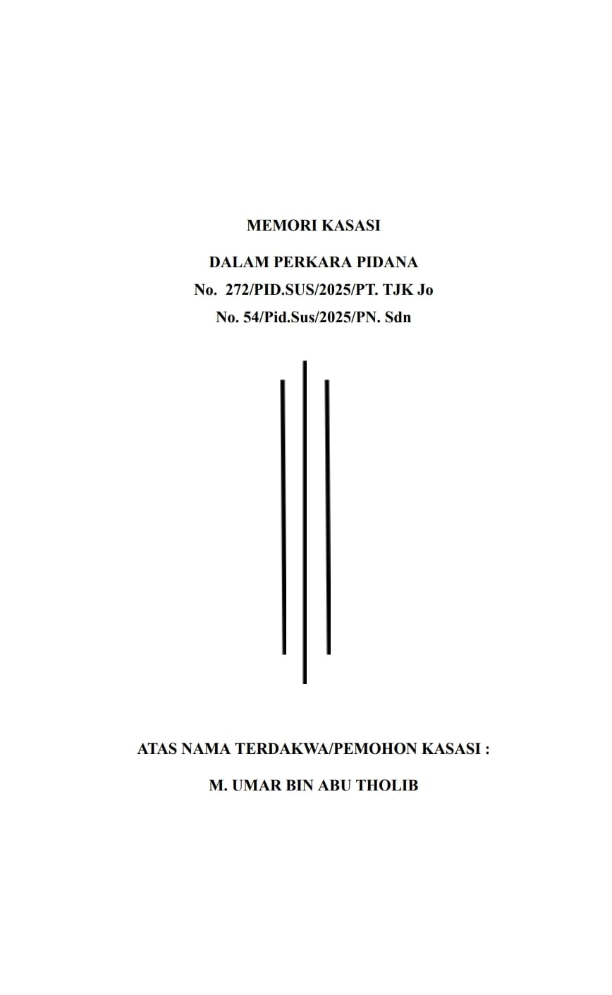 Kasasi = Melalui Tim Firma Hukum Subur Jaya & Partners – FERADI WPI, Dengan Pengacara Donny Andretti, Putusan nya menjadikan Hukuman Terdakwa M. Umar Bin Abu Tholib menjadi primair 5 (lima) tahun ditambah subsidair 3 (tiga) bulan saja.