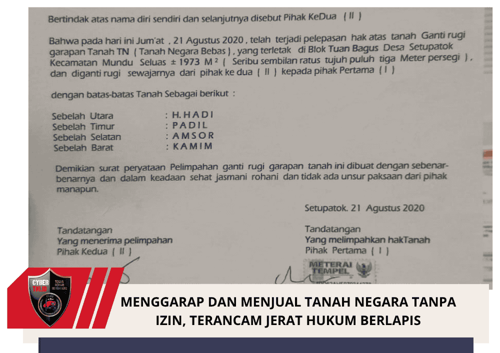 CyberTNI.id | Cirebon, 31 November 2025 —Dugaan praktik jual beli tanah negara kembali mencuat di wilayah Desa Setu Patok, Kecamatan Mundu, Kabupaten Cirebon. Berdasarkan hasil investigasi lapangan Team Cyber TNI ID, ditemukan adanya transaksi jual beli lahan garapan di atas tanah negara yang dilakukan oleh sejumlah pihak tanpa izin resmi dari otoritas berwenang.