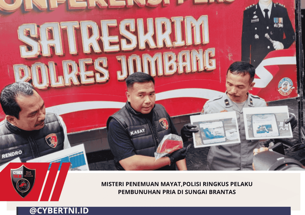 CyberTNI.id | JOMBANG — Misteri penemuan sesosok mayat laki-laki di aliran Sungai Brantas, tepatnya di Dusun Paras, Desa Turipinggir, Kecamatan Megaluh, Kabupaten Jombang, akhirnya berhasil diungkap aparat kepolisian. Dalam waktu relatif singkat, Satreskrim Polres Jombang berhasil menangkap dua orang tersangka yang diduga kuat terlibat dalam kasus pembunuhan berlatar belakang asmara tersebut.