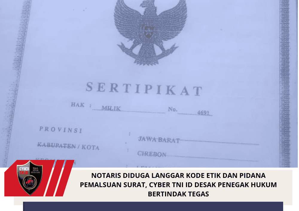 CyberTNI.id | Cirebon, Selasa 4 November 2025 — Dunia kenotariatan di Kabupaten Cirebon kembali tercoreng oleh ulah oknum yang diduga kuat menyalahgunakan kewenangan profesinya. Seorang notaris berinisial SM, yang beralamat di Desa Junjang, Kecamatan Arjawinangun, Kabupaten Cirebon, diduga melakukan pelanggaran serius terhadap kode etik jabatan notaris dan bahkan terindikasi melakukan tindak pidana pemalsuan surat serta penipuan dalam proses peralihan hak atas tanah milik ahli waris almarhum Raden Abdoeri.