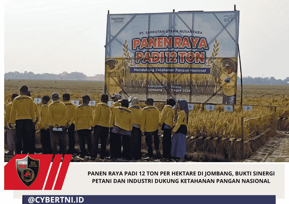 CyberTNI.id | JOMBANG,Selasa 07/04/2026 — Upaya memperkuat ketahanan pangan nasional kembali ditunjukkan melalui kegiatan Panen Raya Padi yang digelar PT Saprotan Utama Nusantara di Desa Pacar Peluk, Kecamatan Megaluh, Kabupaten Jombang,Kegiatan ini mencatat capaian produktivitas tinggi hingga 12 ton gabah per hektare, angka yang dinilai melampaui rata-rata produksi padi nasional.