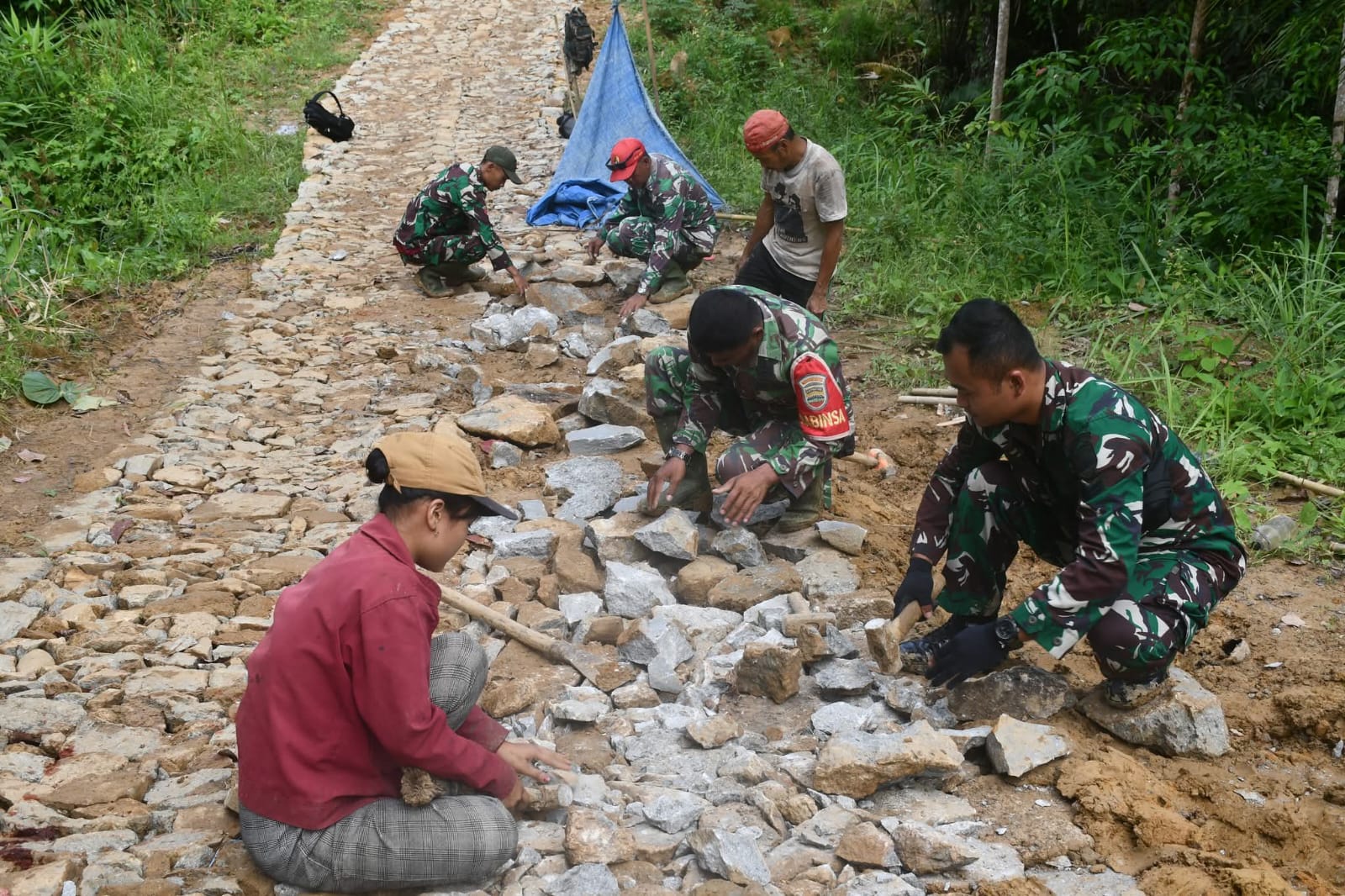 Dengan mengusung semangat gotong royong, personel TNI bersama masyarakat setempat bahu-membahu melakukan peningkatan badan jalan. Material pengerasan didatangkan dari luar desa, alat berat dikerahkan, serta sistem drainase jalan mulai dibenahi.