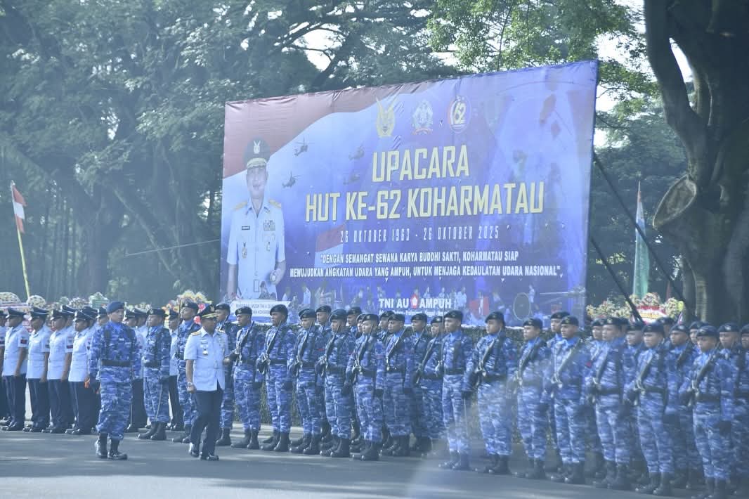 CyberTNI.id | Bandung, Senin 27 Oktober 2025 — Panglima Korps Pasukan Gerak Cepat Marsdya TNI Deny Muis, S.E., M.M., bersama Ketua PIA Ardhya Garini Gabungan Korpasgat Ny. Dewi Deny Muis, menghadiri upacara peringatan Hari Ulang Tahun ke-62 Komando Pemeliharaan Materiil TNI Angkatan Udara (Koharmatau) yang berlangsung di Lapangan Koharmatau, Bandung, Senin (27/10/2025).