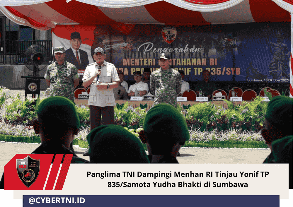 CyberTNI.id | NTB 18 Oktober 2025 — Panglima TNI Jenderal TNI Agus Subiyanto mendampingi Menteri Pertahanan RI Jenderal (Purn) Sjafrie Sjamsoeddin dalam kunjungan kerja ke Markas Sementara Yonif Teritorial Pembangunan (TP) 835/Samota Yudha Bhakti (SYB) di Kabupaten Sumbawa, Nusa Tenggara Barat, Sabtu (18/10/2025). Kunjungan ini bertujuan meninjau kesiapan satuan dalam mendukung pembangunan pertahanan wilayah serta memperkuat konsep pertahanan rakyat semesta yang memberi manfaat langsung bagi masyarakat.