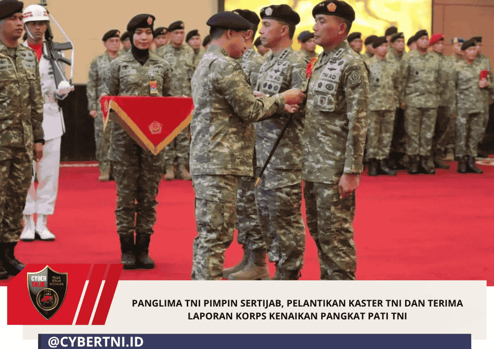 CyberTNI.id | Jakarta — Panglima TNI Jenderal TNI Agus Subiyanto memimpin upacara Serah Terima Jabatan (Sertijab) Pangkogabwilhan III, Oditur Jenderal (Orjen) TNI, pelantikan Kepala Staf Teritorial (Kaster) TNI serta menerima Laporan Korps Kenaikan Pangkat Pati TNI yang berlangsung di Aula Gatot Soebroto, Mabes TNI, Cilangkap, Jakarta Timur, Kamis (26/3/2026).