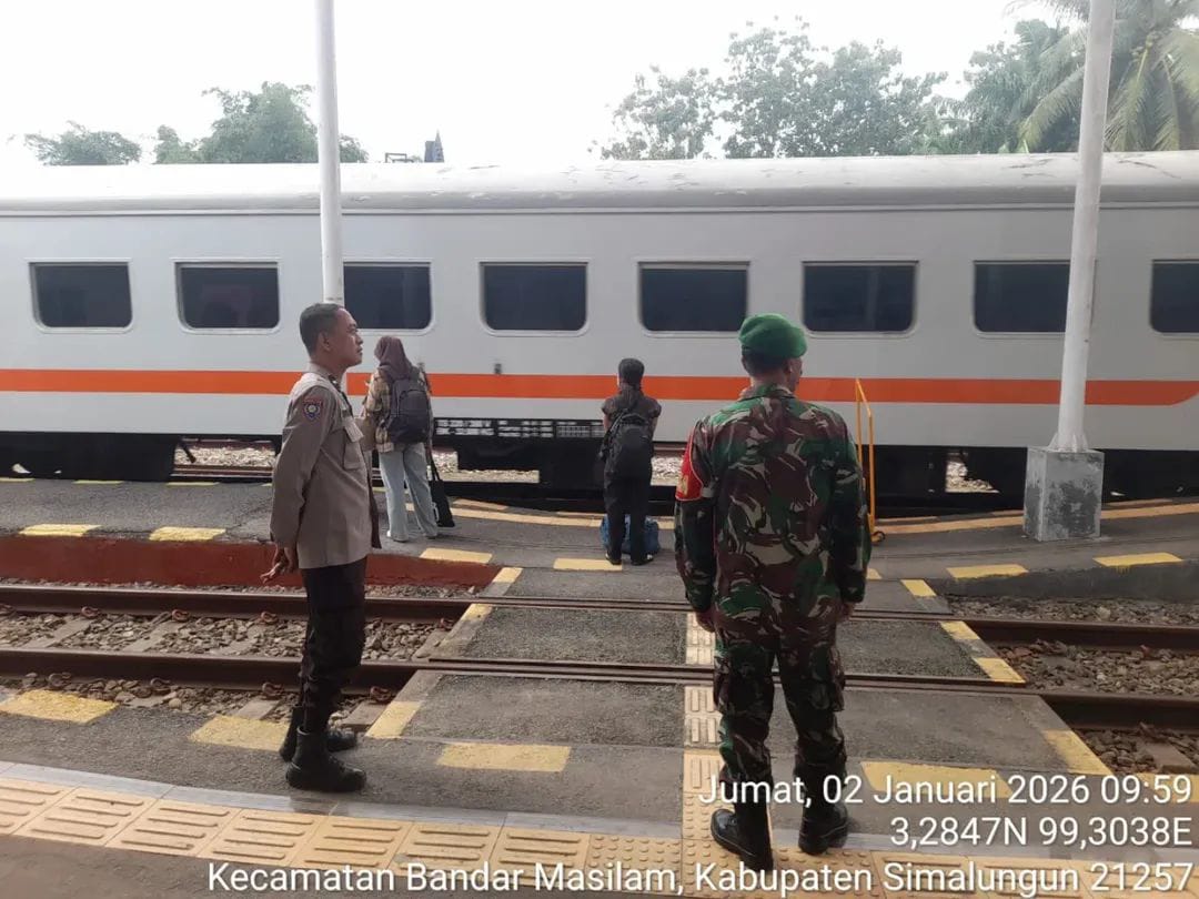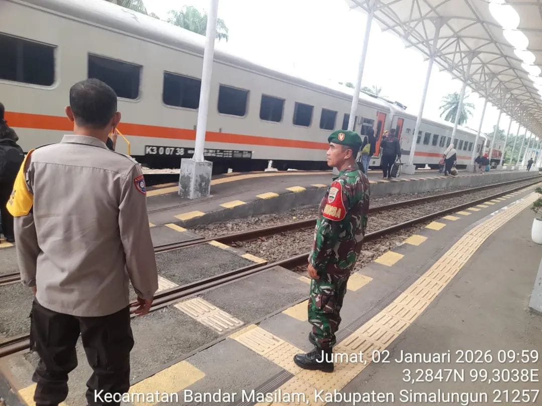 CyberTNI.id |Simalungun, Jumat 2 Januari 2026 – Dalam rangka memberikan rasa aman dan nyaman kepada masyarakat selama arus libur Natal dan Tahun Baru 2025–2026, Babinsa Koramil 06/Perdagangan Kodim 0207/Simalungun, Sertu Sutikno, melaksanakan kegiatan pengamanan (Pam) Nataru di Stasiun Kereta Api Bandar Tinggi, Kecamatan Bandar Masilam, Kabupaten Simalungun, pada Jumat (02/01/2026).