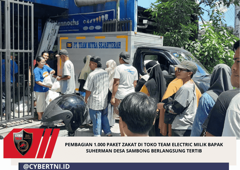 CyberTNI.id | Jombang – Kegiatan pembagian zakat kepada masyarakat digelar di toko TEAM ELECTRIC milik Bapak H.Suherman yang berada di Jalan KH. Wahab Hasbullah No.06, Desa Sambong, Kabupaten Jombang.Dalam kegiatan tersebut pemilik toko H.Suherman tidak berada di rumah karena sedang ada kegiatan di luar kota. Dalam hal kegiatan ini perwakilan panitia menyalurkan sekitar 1.000 paket zakat kepada warga yang membutuhkan.