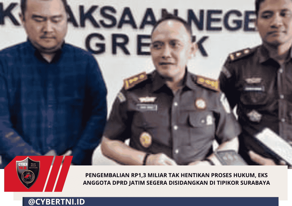 CyberTNI.id | GRESIK,Rabu (18/3/2026) —Kejaksaan Negeri Gresik menerima pengembalian kerugian negara sebesar Rp1,3 miliar dari tersangka Bambang Suhartono, mantan anggota DPRD Jawa Timur, melalui kuasa hukumnya.