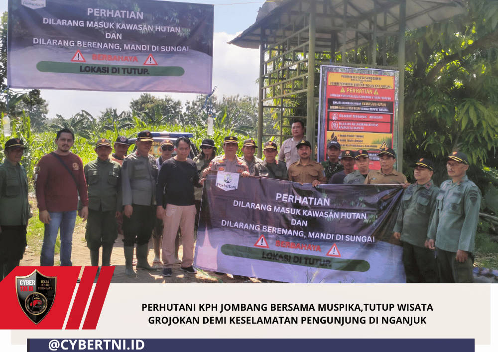 CyberTNI.id | JOMBANG, (17/04/2026) — Perhutani Kesatuan Pemangkuan Hutan (KPH) Jombang bersama Muspika Kecamatan Lengkong, Kabupaten Nganjuk, menutup Wisata Kali Grojokan Duwur, guna menghindari timbul korban karena lokasi tebing berbahaya, curah hujan tinggi berpotensi air bah (luapan air deras yang datang tiba-tiba dari atas), longsor, pohon tumbang, dan licin saat hujan.