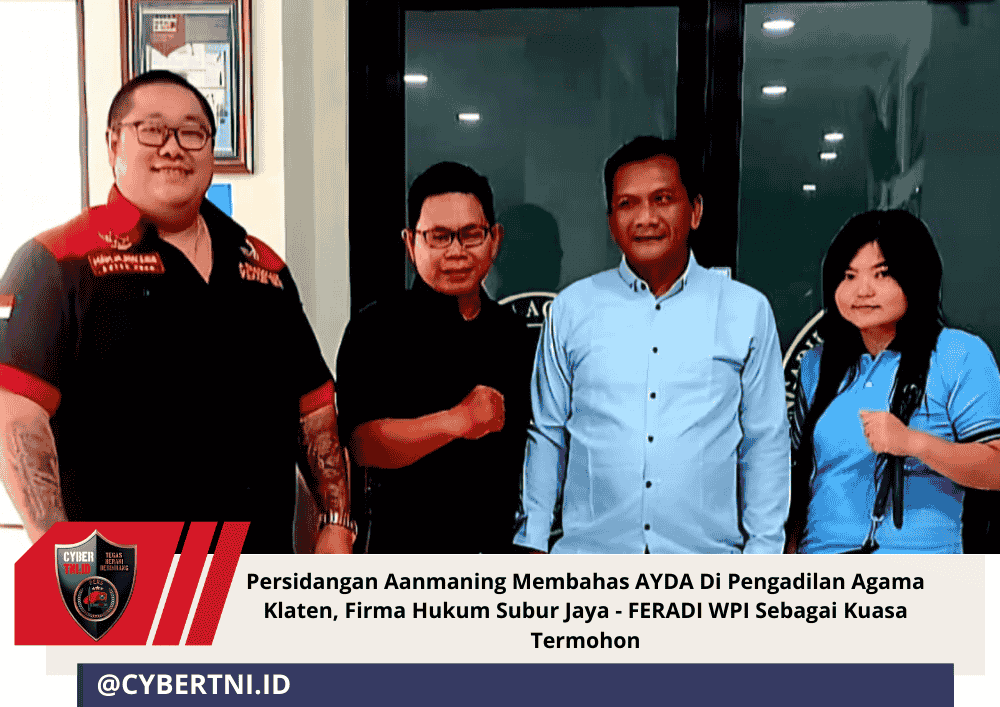 CyberTNI.id | Senin 22 Desember 2025 —Pengadilan Agama Klaten, Jawa Tengah, Advokat / Pengacara Senior dan Kawakan Bapak Donny Andretti, S.H., S.Kom., M.Kom., C.Md., C.PFW., C.MDF., C.JKJ. didampingi FILEMON GUNAWAN DIRJANTO SH, ADVOKAT MAGANG dan BASRIYANTO KEPALA DIVISI DPP FERADI WPI, CECILIA SH MH ADVOKAT MAGANG DAN M. Arifin SH MH S.Sos., M.M., C.MDF., C.PFW. C.JKJ. WAKETUM III DPP FERADI WPI, sebagai Kuasa Hukum Para Termohon Aanmaning menghadiri Sidang lanjutan Aanmaning di Pengadilan Agama Klaten dengan Nomor Perkara 0009/Pdt.Eks.HT/2025/PA.Klt.