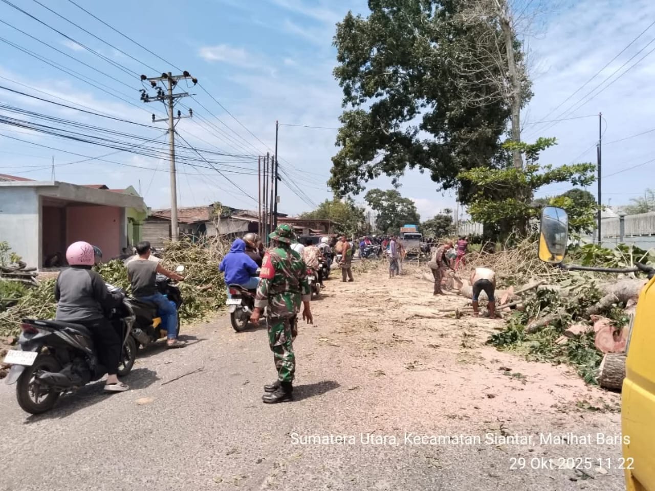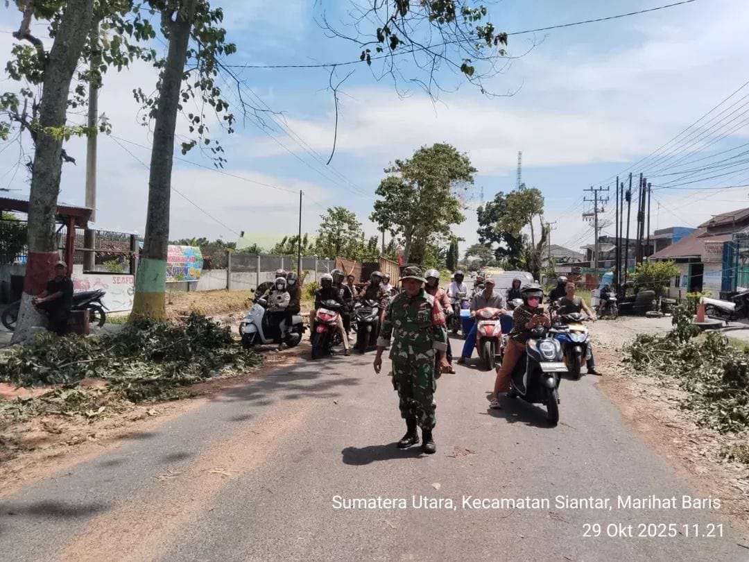 CyberTNI.id | Simalungun, 29 Oktober 2025 — Guna menjaga keselamatan masyarakat dan kelancaran arus lalu lintas, personel Koramil 08/Bangun Kodim 0207/Simalungun, yakni Serka I. Rumahorbo dan Serda A. Difa, kembali melaksanakan kegiatan pendampingan perantingan atau pemotongan cabang pohon rawan tumbang di sepanjang Jalan Asahan, Rabu (29/10/2025) pukul 10.00 WIB.
