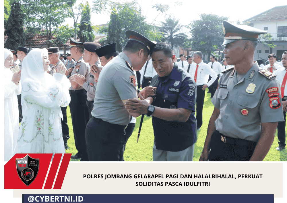CyberTNI.id | Jombang — Mengawali pelaksanaan tugas pasca libur Idulfitri 1447 Hijriah, Polres Jombang menggelar apel pagi yang dirangkaikan dengan kegiatan halalbihalal di Lapangan Apel Mapolres Jombang, Senin (30/3/2026) pagi. Kegiatan tersebut dipimpin langsung oleh Kapolres Jombang, AKBP Ardi Kurniawan, S.H., S.I.K., CPHR, serta dihadiri oleh Pejabat Utama (PJU), para Kapolsek jajaran, Personel Polres Jombang, serta Ketua Bhayangkari Ny. Olivia Ardi bersama pengurus Bhayangkari Cabang Jombang.