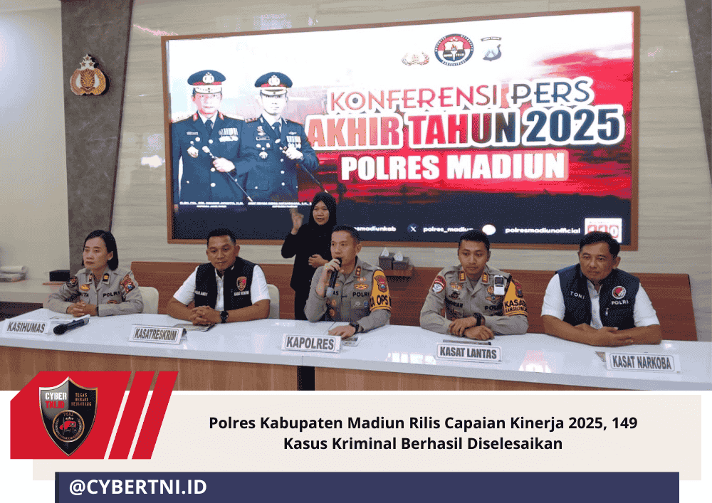CyberTNI.id | MADIUN,Senin (29/12/2025) — Kepolisian Resor (Polres) Kabupaten Madiun menggelar Press Release Akhir Tahun 2025 yang dipimpin langsung oleh Kapolres Kabupaten Madiun AKBP Kemas Indra Natanegara, S.H., S.I.K., M.Si, didampingi Kasi Humas IPTU Anita Diah Puspitosari, S.H. Kegiatan tersebut berlangsung di Mapolres Kabupaten Madiun dan dihadiri puluhan awak media dari media cetak, elektronik, serta media online.