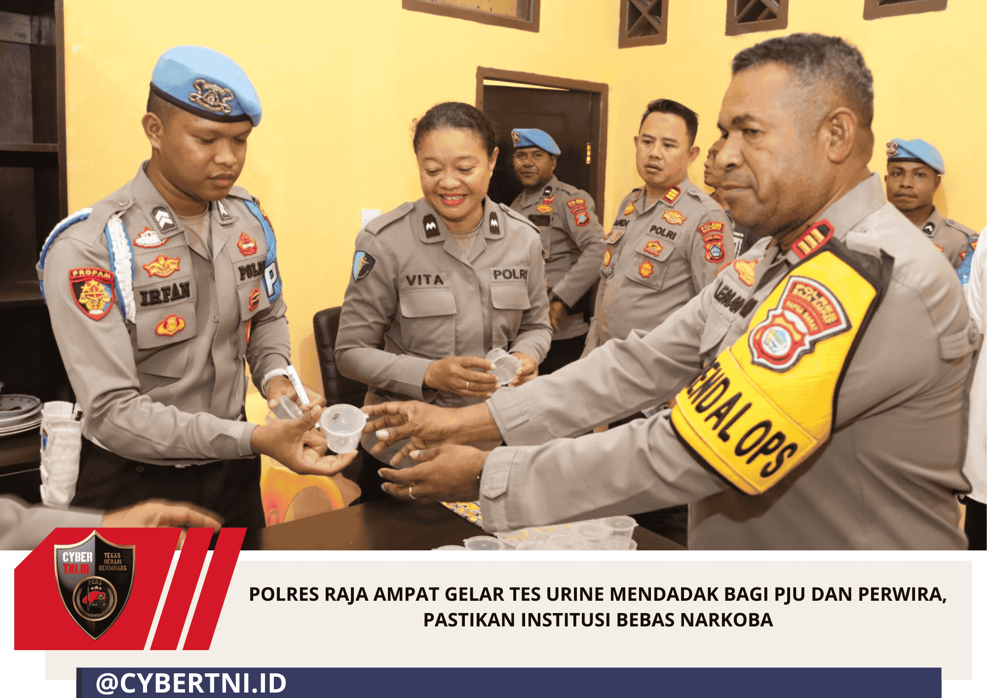 CyberTNI.id | Raja Ampat – Polres Raja Ampat menggelar pemeriksaan urine mendadak bagi jajaran Pejabat Utama (PJU) dan seluruh perwira di lingkungan Polres Raja Ampat. Langkah ini dilakukan untuk memastikan seluruh pimpinan di satuan tersebut bersih dari penyalahgunaan narkotika.