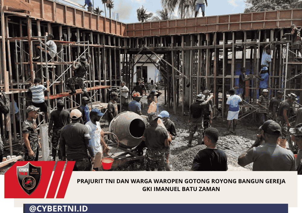 CyberTNI.id | Waropen — Semangat kebersamaan dan gotong royong terlihat dalam kegiatan karya bakti yang dilakukan prajurit Yonif TP 860/NSK bersama masyarakat di Gereja GKI Imanuel Batu Zaman, Kampung Ronggaiwa, Kabupaten Waropen, Papua, Jumat (20/2/2026).