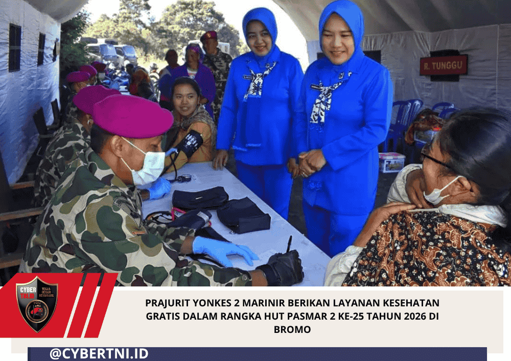 CyberTNI.id | Bromo — Prajurit Batalyon Kesehatan 2 Marinir ikut serta berpartisipasi dalam kegiatan Bakti Sosial Kesehatan (Baksoskes) pada peringatan Hari Ulang Tahun Pasmar 2 ke-25 Tahun 2026, tepatnya di Bromo, Tengger, Jawa Timur, Sabtu (18/04/2026).