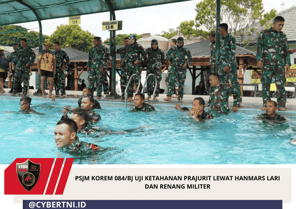 CyberTNI.id | Surabaya CyberTNI.id – Korem 084/Bhaskara Jaya menggelar Penilaian Siap Jasmani Militer (PSJM) di Makorem 084/BJ, Kamis (12/2/2026), sebagai upaya menguji kesiapan fisik dan mental prajurit secara komprehensif. Kegiatan yang dipimpin Kasiops Kasrem 084/BJ Kolonel Inf Agus Al Fauzi, S.I.P., M.I.Pol., selaku Danlat itu meliputi gerak jalan militer (Hanmars) sejauh 10 kilometer dan renang militer dasar 50 meter di Kolam Renang Kodam V/Brawijaya.