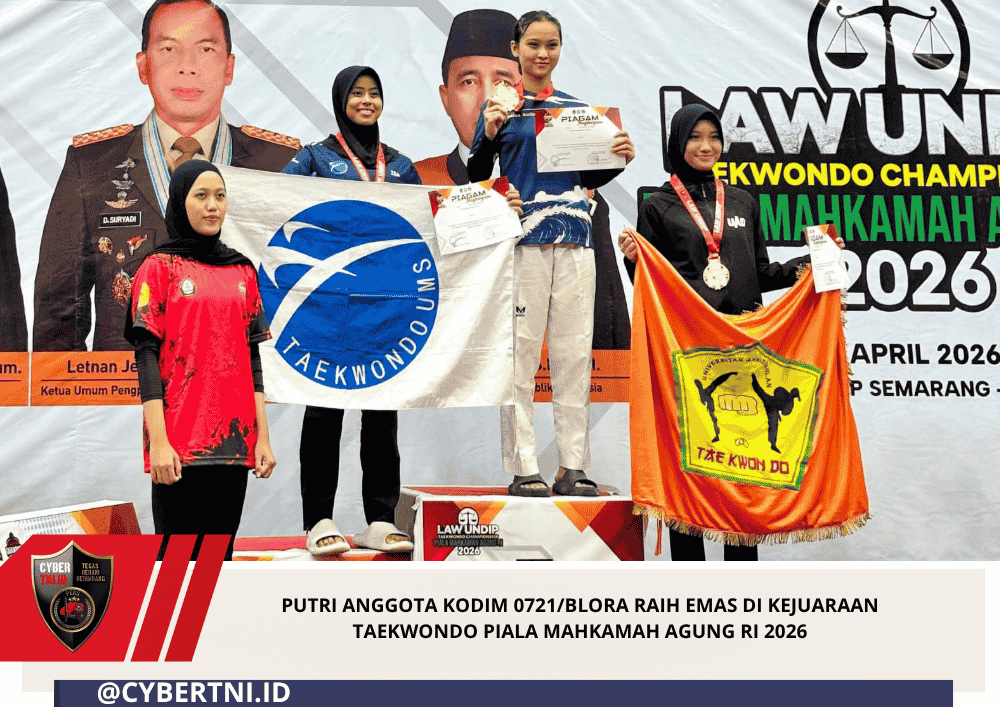 CyberTNI.id | Blora, 19 April 2026 — Serda (K) Salsabila Aulia Mahardika (22), atlet taekwondo Pusdikjas Disjasad Bandung asal Kabupaten Blora, berhasil meraih juara pertama dalam ajang Law Undip Taekwondo Championship 2026 yang memperebutkan Piala Mahkamah Agung RI.