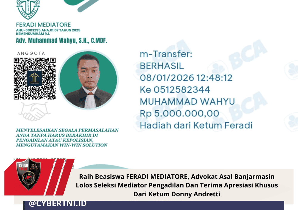CyberTNI.id | BANJARMASIN – Sebuah kisah perjuangan dan keajaiban hukum datang dari Kalimantan Selatan. Adv. Muhammad Wahyu, S.H., C.MDF., seorang advokat yang juga sehari-hari bekerja sebagai driver ojek online (ojol), resmi ditetapkan sebagai Mediator Non Hakim di Pengadilan Negeri (PN) Banjarmasin. Keberhasilan ini menjadi bukti nyata legalitas sertifikasi Perkumpulan / Organisasi FERADI MEDIATORE yang diakui secara sah oleh institusi peradilan.