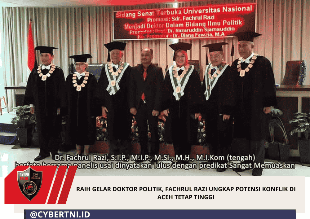 CyberTNI.id | JAKARTA,Minggu (1/3/2026) — Tokoh politik Indonesia dan mantan senator DPD RI dari Aceh, Dr. Fachrul Razi, S.I.P., M.I.P., M.Si., M.H., M.I.Kom, telah resmi menyandang gelar doktor ilmu politik dari Universitas Nasional Jakarta setelah berhasil mempertahankan disertasinya di hadapan panel penguji, bertempat di Menara Universitas Nasional, Selasa (24-02-2026). Disertasinya yang berjudul ” Integrasi Politik di Aceh Pasca MoU Helsinki: Studi Pelembagaan Politik Wali Nanggroe (2013-2024),” memberikan analisis yang serius tentang lanskap politik Aceh dan memperingatkan bahwa potensi konflik antara Aceh dan pemerintah pusat tetap sangat tinggi.