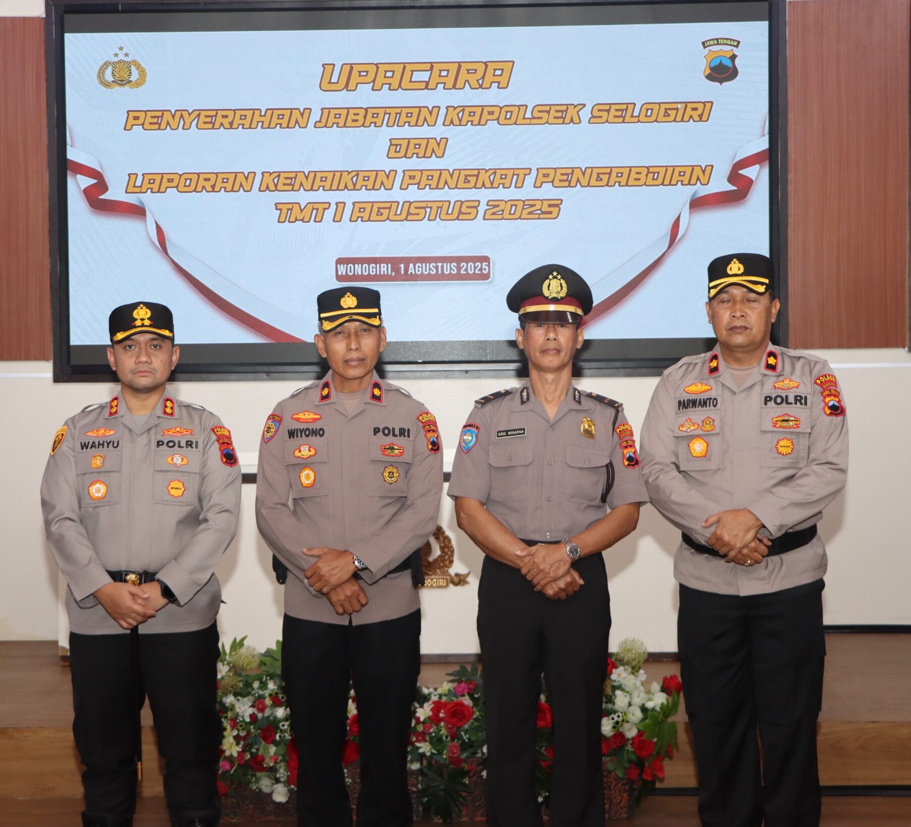 CyberTNI.id | Wonogiri – Rasa haru dan khidmat mewarnai Aula Sanika Satyawada Polres Wonogiri saat digelar Upacara Penyerahan Jabatan Kapolsek Selogiri dan Laporan Kenaikan Pangkat Pengabdian TMT 1 Agustus 2025. Kegiatan berlangsung pada Jumat pagi (1/8/2025) dengan dihadiri jajaran pejabat utama dan personel Polres Wonogiri.
