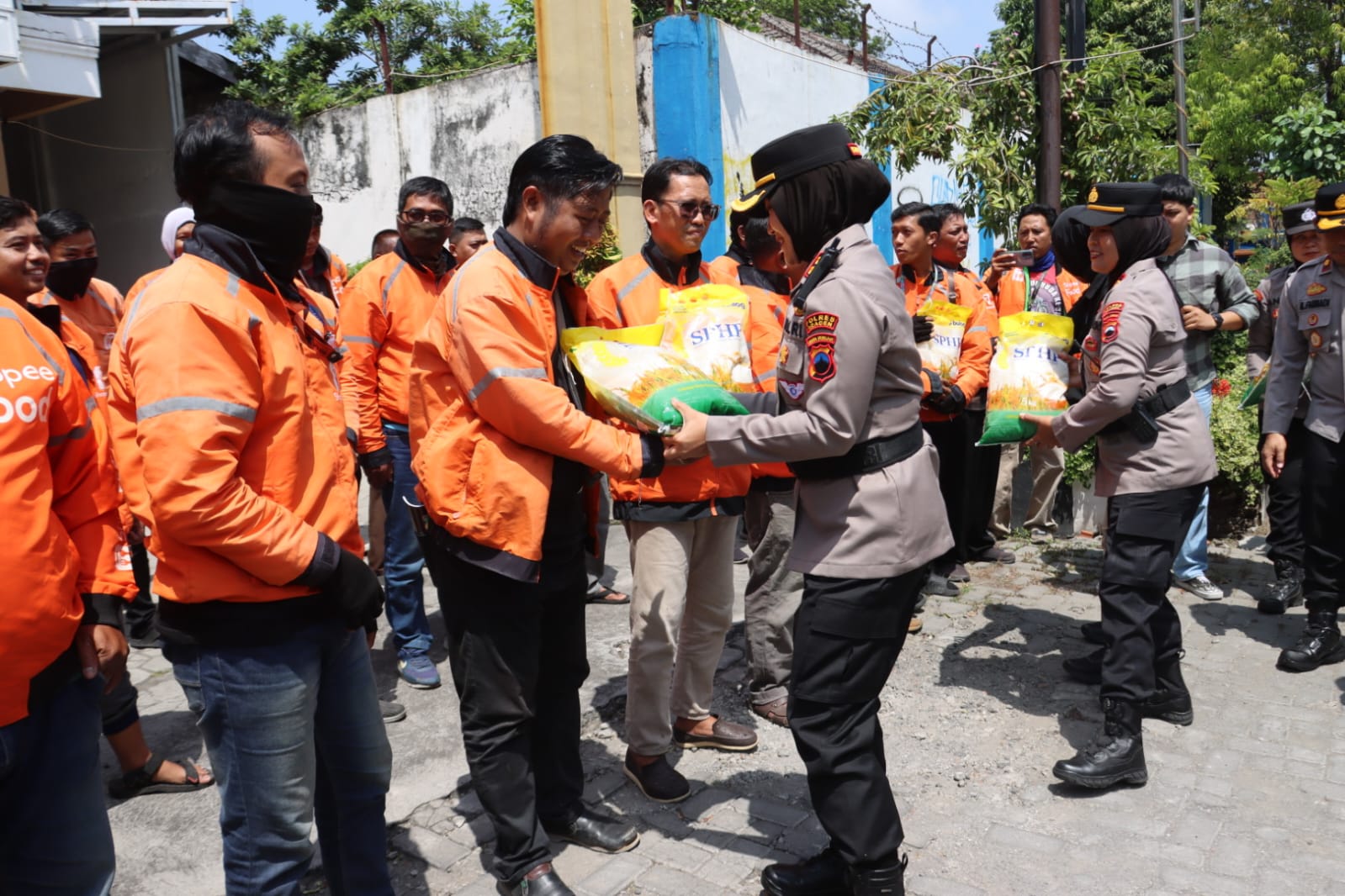 RATUSAN OJOL DI SRAGEN TERIMA BANTUAN BERAS DARI KAPOLRES SRAGEN