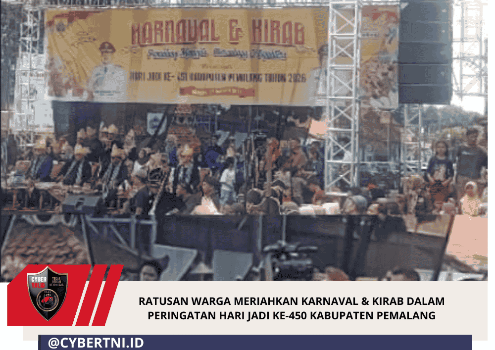 CyberTNI.id | Pemalang,25 Januari 2026 — Ribuan masyarakat dari berbagai penjuru Kabupaten Pemalang memenuhi lokasi kegiatan Karnaval & Kirab yang diselenggarakan dalam rangka peringatan Hari Jadi ke-450 Kabupaten Pemalang, Sabtu (tanggal acara). Acara ini berlangsung meriah dengan berbagai atraksi budaya dan partisipasi masyarakat dari seluruh kecamatan.