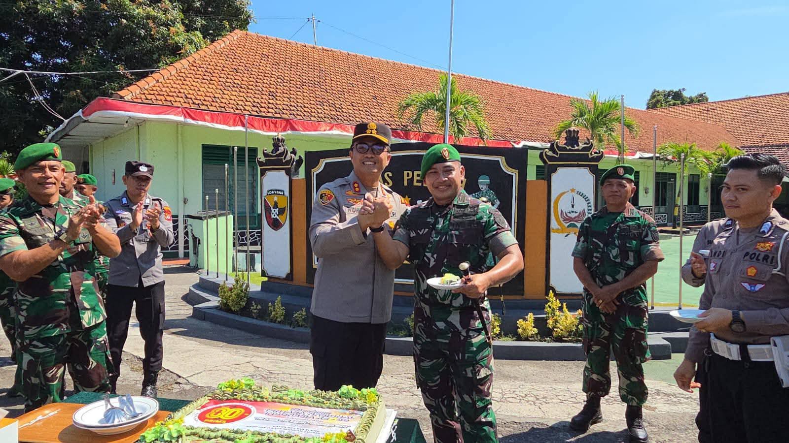 CyberTNI.id | Singaraja, Minggu 5 Oktober 2025 – Suasana hangat dan penuh kebersamaan terasa di Mako Secata Rindam IX/Udayana, Banyuning, Singaraja, saat seluruh personel menerima kejutan istimewa dari Kapolres Buleleng AKBP Ida Bagus Widwan Sutadi, S.I.K., M.H., beserta jajarannya, Minggu (5/10/2025). Kejutan tersebut berupa ucapan selamat ulang tahun dalam rangka memperingati HUT ke-80 Tentara Nasional Indonesia (TNI).
