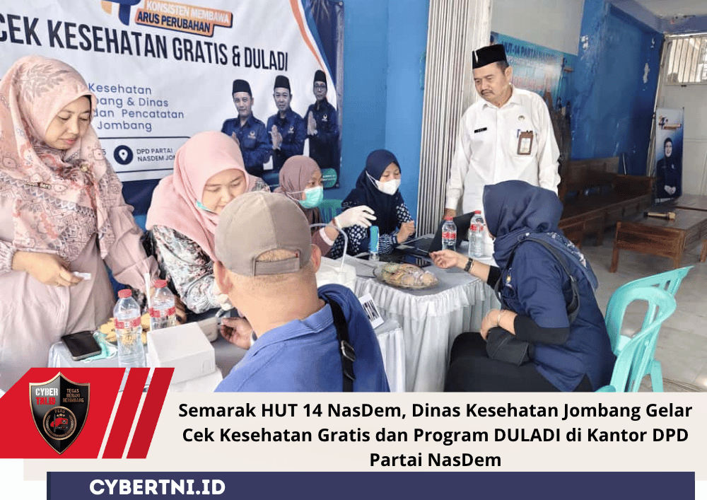 CyberTNI.id |Jombang, Senin (20/10) – Dalam suasana siang yang hangat dan penuh kebersamaan, DPD Partai NasDem Kabupaten Jombang sukses menggelar kegiatan sosial dalam rangka HUT ke-14 Partai NasDem, berupa cek kesehatan gratis bekerja sama dengan Dinas Kesehatan Kabupaten Jombang serta program DULADI (Duduk Langsung Jadi) bersama Dinas Dukcapil Jombang.