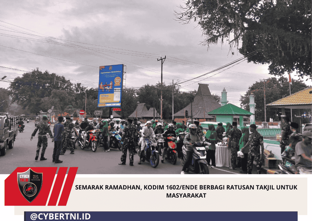 CyberTNI.id | Ende – Dalam rangka menyemarakkan bulan suci Ramadhan 1447 Hijriah, Kodim 1602/Ende menggelar aksi sosial dengan membagikan ratusan paket takjil kepada masyarakat di sekitar Makodim, Selasa (10/3/2026) sore. Kegiatan ini menjadi bentuk kepedulian TNI kepada warga yang sedang menjalankan ibadah puasa.