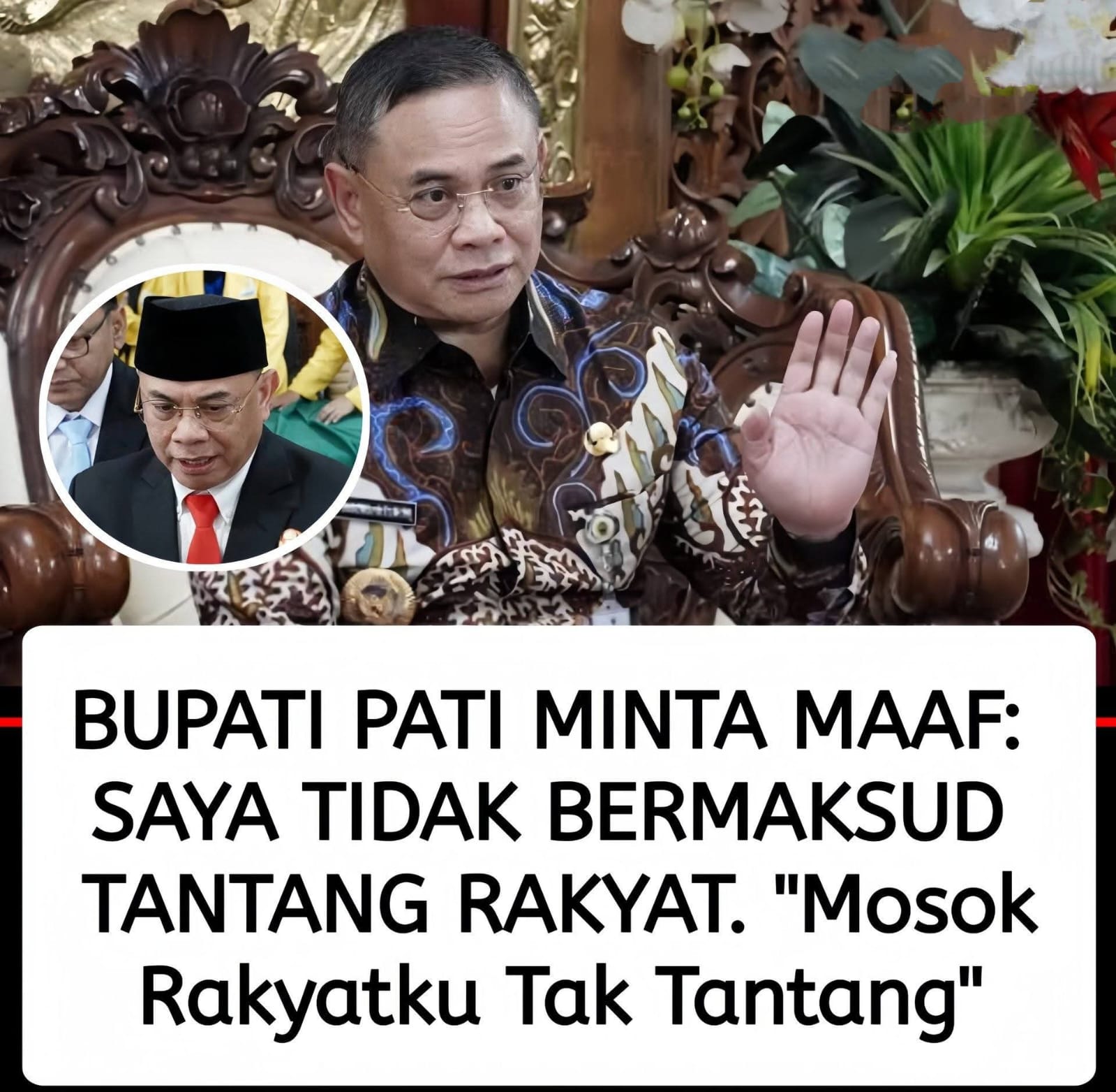 “Saya mohon maaf yang sebesar-besarnya. Saya tidak ada maksud untuk menantang rakyat saya. Masak iya, rakyat sendiri saya tantang?” ujar Bupati dengan nada tulus saat memberikan keterangan resmi di hadapan awak media.