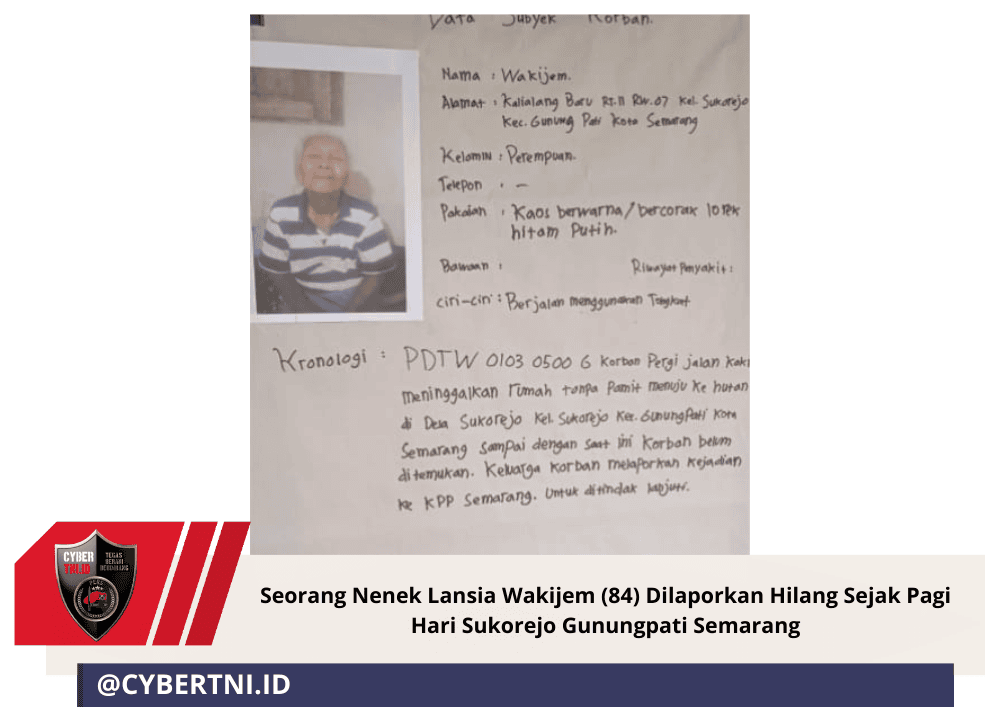 CyberTNI.id | Minggu, 4 Januari 2026 — Wakijem warga Kalilalang Baru Rt. 011/ Rw. 007 Kelurahan Sukorejo Kecamatan Gunungpati Kota Semarang, dilaporkan hilang terakhir terlihat berada di rumahnya pada Sabtu, 3 Januari 2026 dini hari sekitar pukul 04.30 WIB, namun sejak saat itu keberadaannya tidak diketahui lagi. Ronzi (37) anak korban, ” Seperti biasanya ibu sudah bangun sejak subuh, pagi itu masih terdengar suara ibu membuat teh di rumah,” ungkap Ronzi yang terlihat sedih.