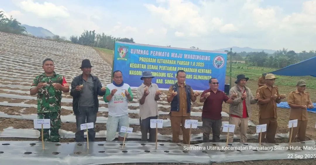 CyberTNI.id | Simalungun, Senin 22 September 2025 – Semangat kebersamaan terlihat di Nagori Mardingding, Kecamatan Pamatang Silimahuta, Kabupaten Simalungun, pada Senin (22/09/2025). Babinsa Koramil 12/Saribudolok Kodim 0207/Simalungun, Kopda Tuah M Damanik, turut hadir dan mendukung kegiatan launching penanaman kentang yang digagas oleh Badan Usaha Milik Nagori (BUMNag) Mardingding.