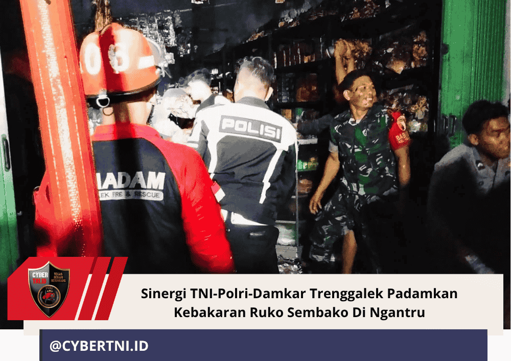 CyberTNI.id |Trenggalek, kamis 16 Oktober 2025 – Kolaborasi cepat antara TNI, Polri, dan petugas pemadam kebakaran kembali menuai apresiasi masyarakat. Kamis malam (16/10/2025) sekitar pukul 21.30 WIB, sinergi lintas instansi ini berhasil memadamkan kebakaran hebat yang melanda sebuah ruko grosir sembako di Kelurahan Ngantru, Kecamatan/Kabupaten Trenggalek. Berkat kerja sama solid dan gerak cepat di lapangan, api berhasil dijinakkan dalam waktu kurang dari satu jam.